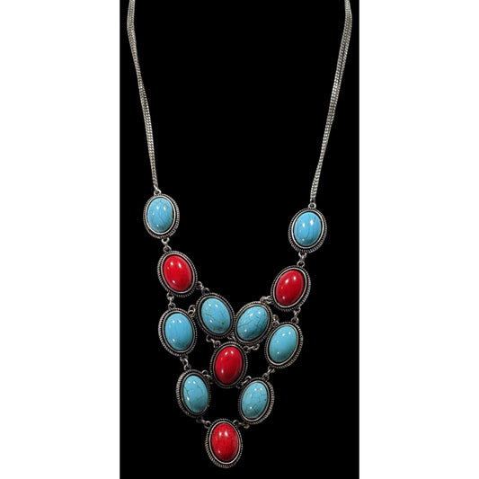 Southwestern Red And Faux Turquoise Cabochon Statement Necklace With Matching Earrings