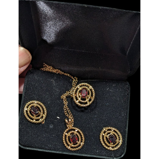 Vintage Garnet Gold Tone Demi Parure (Earrings, Necklace, Ring)