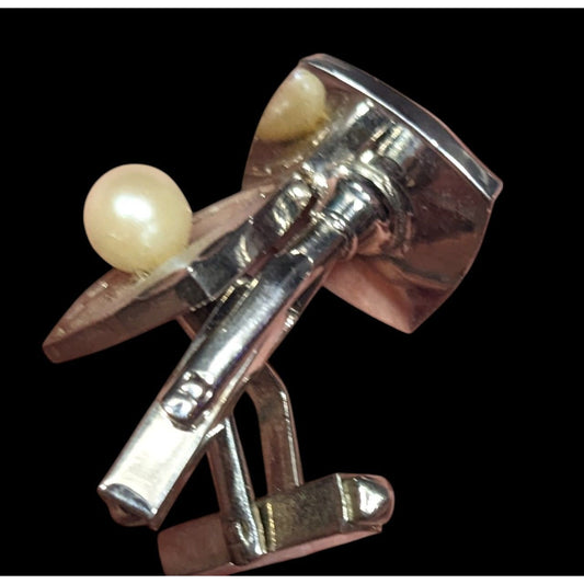 Vintage Engraved Square Silver Tone Cufflinks With Faux Pearl Accents