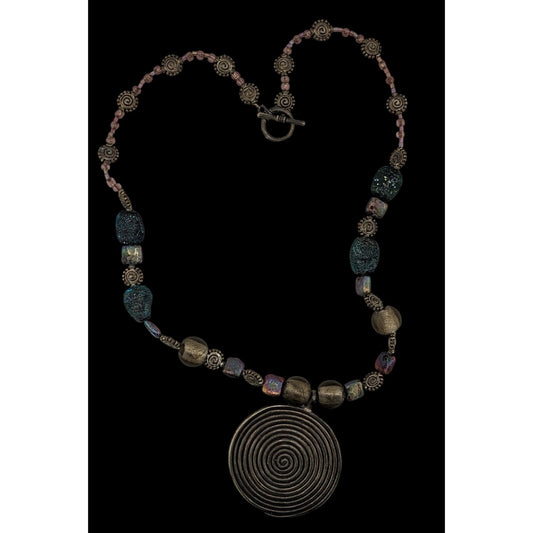 Vintage Brutalist Pendant Necklace With Metal Glass And Pearl Beads