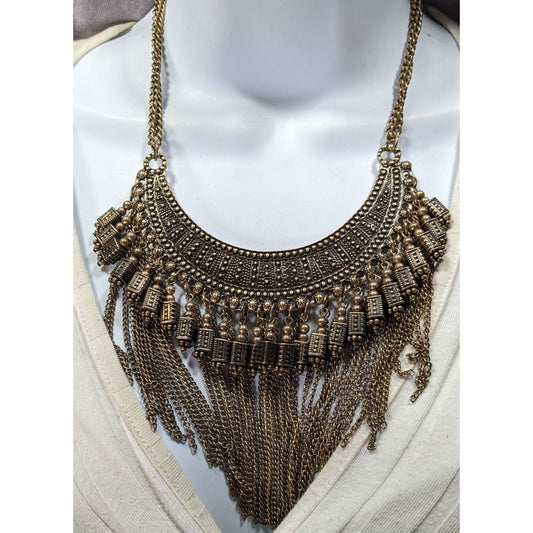 Bohemian Fringe Antiqued Gold Tone Statement Necklace With Chains & Dangling Beads