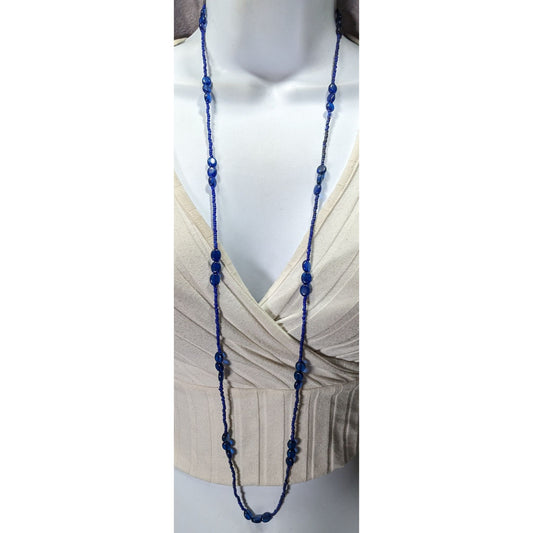 Long Blue Beaded Necklace With Oval Acrylic Beads & Tiny Seed Beads
