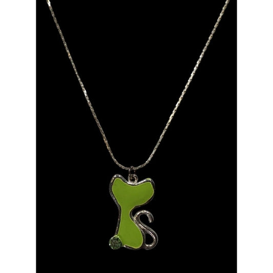 Retro Green Enamel Cat Pendant Necklace With Silver Tone Chain