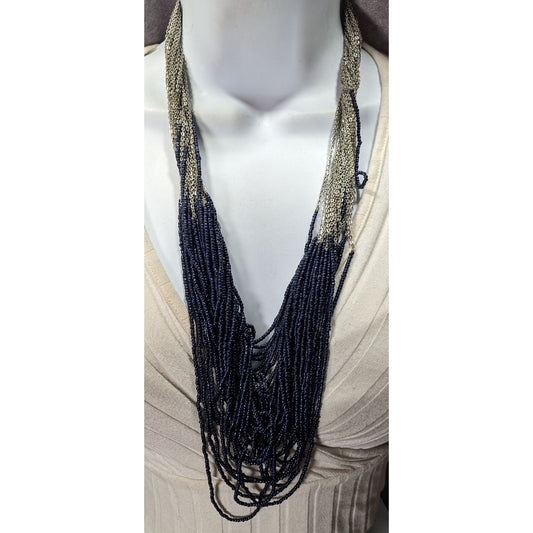 Elegant Multi-Strand Navy Bead & Silver Chain Statement Necklace