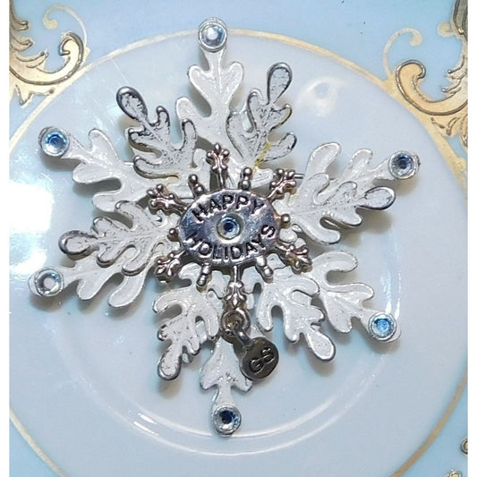 Vintage White Snowflake Brooch With Silver Tone And Blue Accents