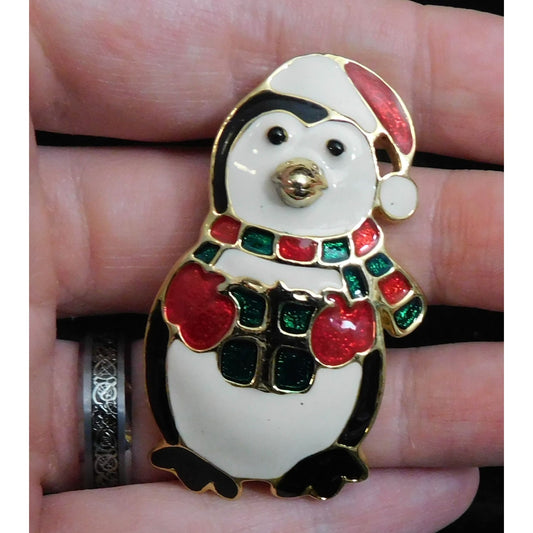 Vintage Christmas Penguin Holding Present Brooch