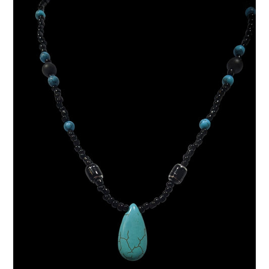 Turquoise & Black Beaded Necklace W/ Teardrop Pendant