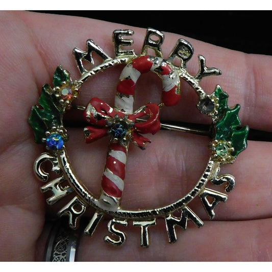 Vintage Merry Candy Cane Wreath Christmas Brooch