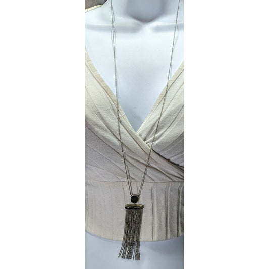 Loft Boho Chic Long Silver Tone Tassel Pendant Necklace With Chain Fringe & Oval Accent