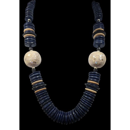 Vintage Chunky Blue Wooden Disc And Shell Beaded Necklace