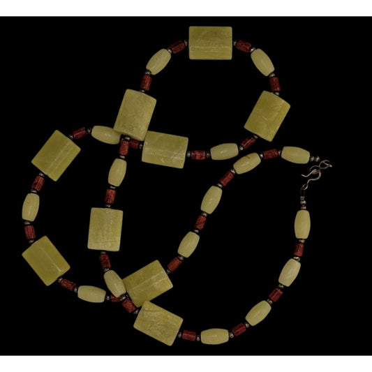 Vintage Handmade Jade And Coral Beaded Necklace With Sterling Accent Beads