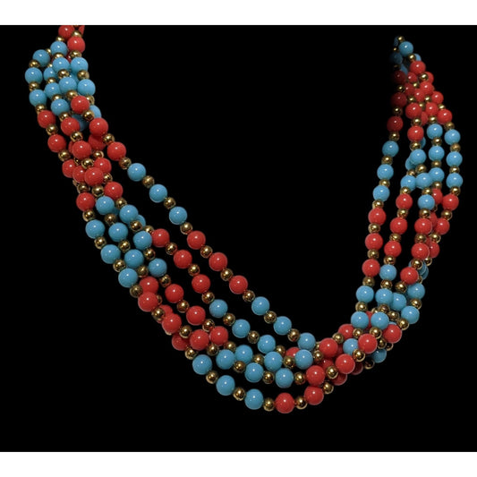 Vintage Multistrand Red Blue And Gold Tone Beaded Necklace