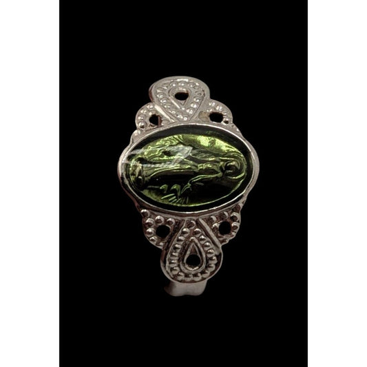Miraculous Medal Adjustable Silver Ring With Green Oval Enamel Center Size 5