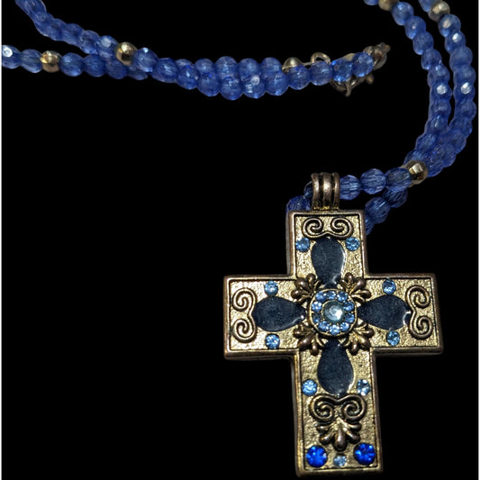 Vintage 90s Blue And Silver Beaded Cross Necklace