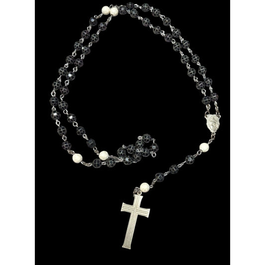 Vintage Black White And Silver Tone Textured Beaded Rosary Necklace