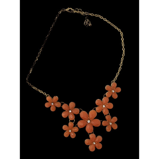 Retro Orange Floral Statement Necklace With Gold-Tone Chain And Rhinestone Accents