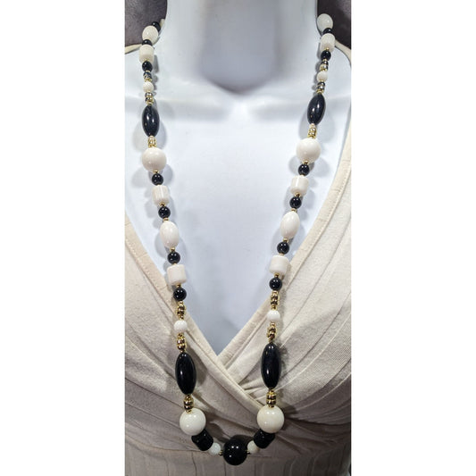 Retro Black White And Gold Tone Beaded Necklace