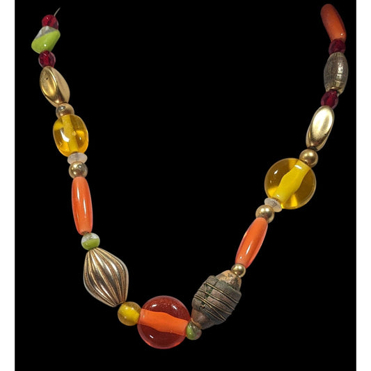 Handmade Retro Orange And Yellow Glass And Metal Beaded Necklace