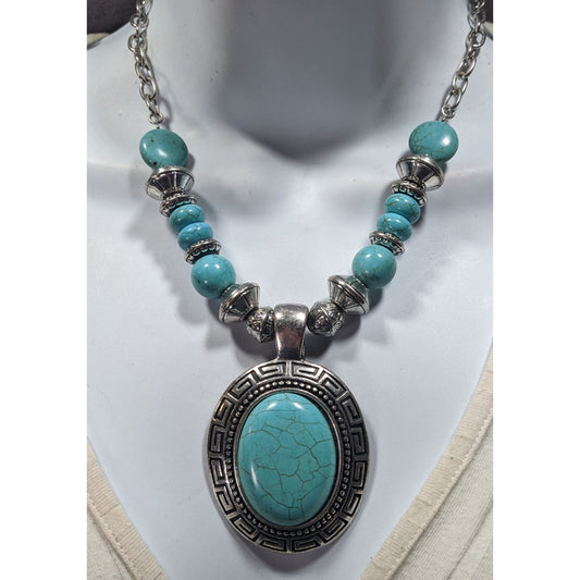Bohemian Faux Turquoise Silver Tone Medallion Necklace