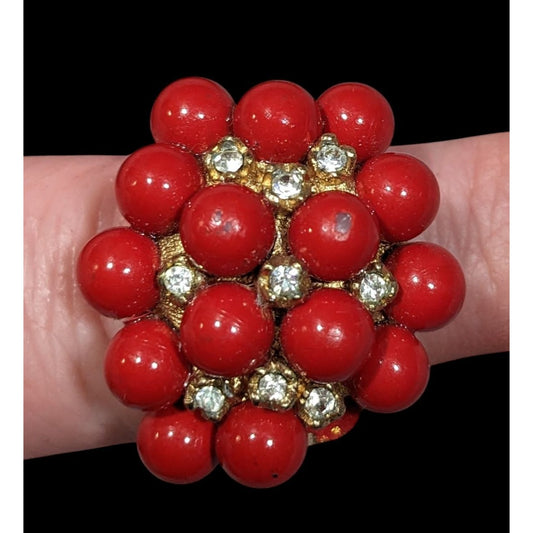 Vintage Chunky Red And Gold Tone Beaded Rhinestone Ring Size 7 3/4
