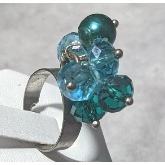 Blue Beaded Silver Tone Adjustable Cluster Ring Size 6