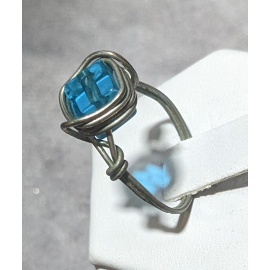 Blue And Silver Tone Wire Wrapped Handmade Glass Beaded Ring Size 7