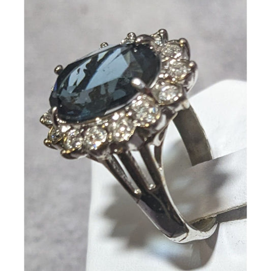 Elegant Whimsical Faux Sapphire Silver Tone Halo Ring Size 9