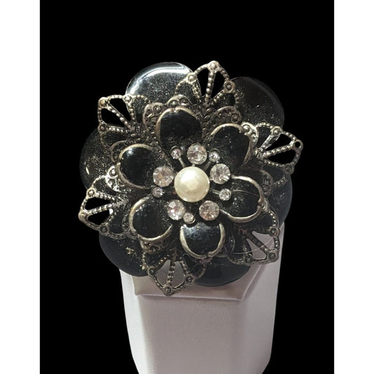 Vintage Whimsygoth Floral Black And Silver Tone Statement Stretch Ring Size 9