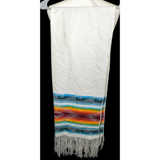 Handwoven Southwestern White And Rainbow Scarf With Fringe