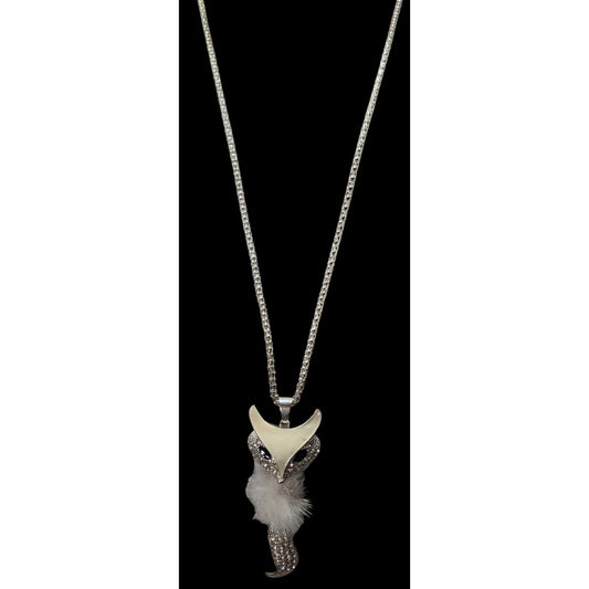 Fox-Inspired Rhinestone Pendant Necklace With White Fluffy Accent On Silver Chain