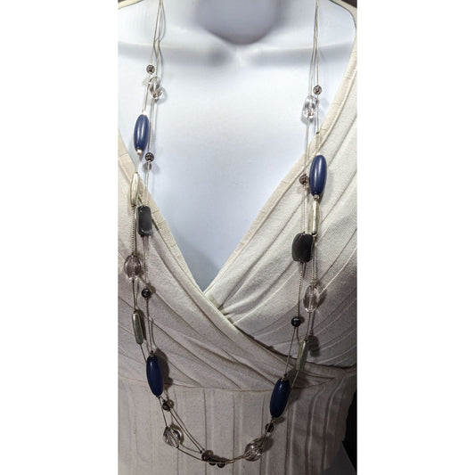 Multi-Strand Beaded Necklace With Blue Silver & Clear Beads On Silver-Tone Chain
