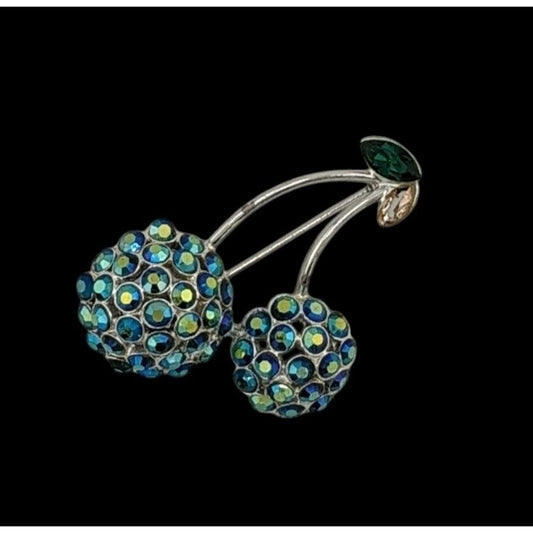 Vintage Rockabilly BSK Cherry Figural Brooch Silver Tone With Blue Rhinestones