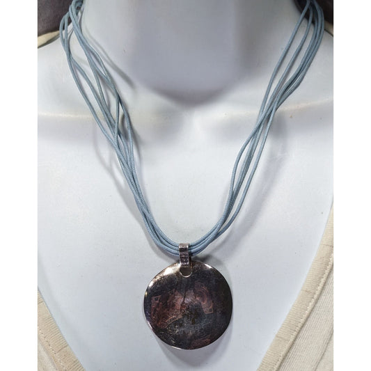 Distressed Casual Round Pendant Necklace With Multi-Strand Light Blue Cord