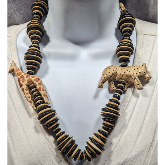 Vintage Hand Carved Safari Themed Wooden Necklace