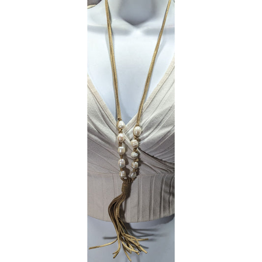Boho Chic Faux Suede And Pearl Beaded Tassel Necklace