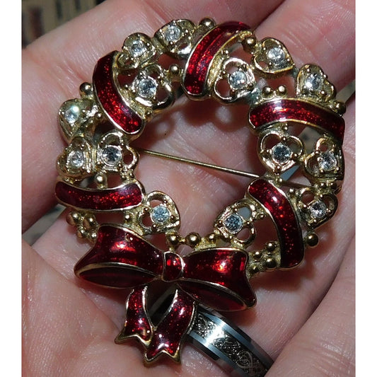 Vintage Hearts And Bows Wreath Brooch With Rhinestones