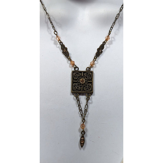 Vintage Floral Antiqued Gold Tone Necklace With Champagne Rhinestone Accents