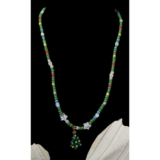 Handmade Green Glass Holiday Beaded Christmas Tree Necklace