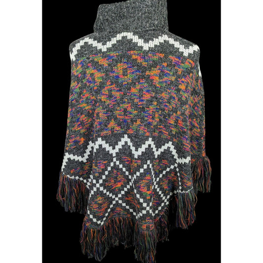 Modena Grey And Rainbow Geometric Cowl Neck Fringe Poncho