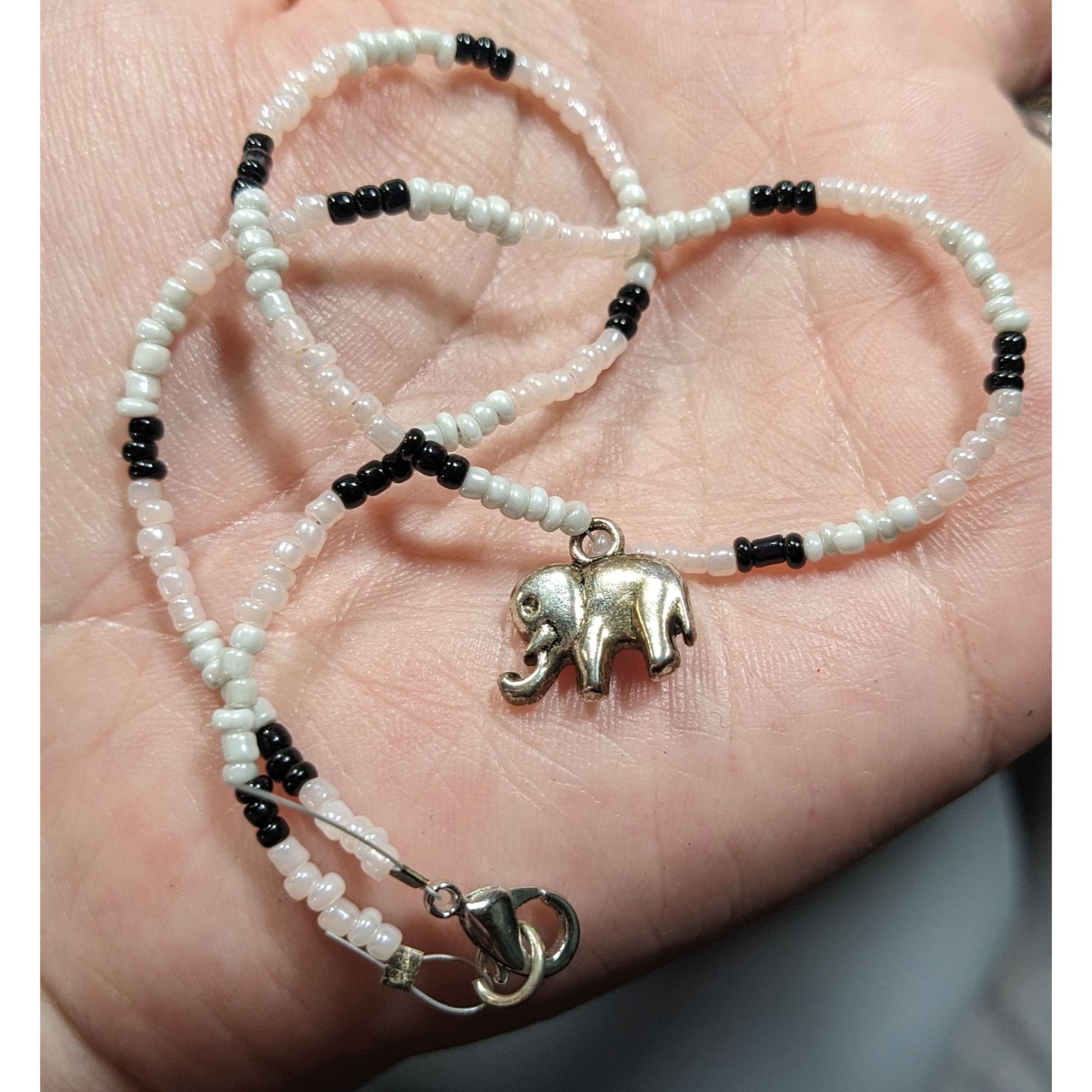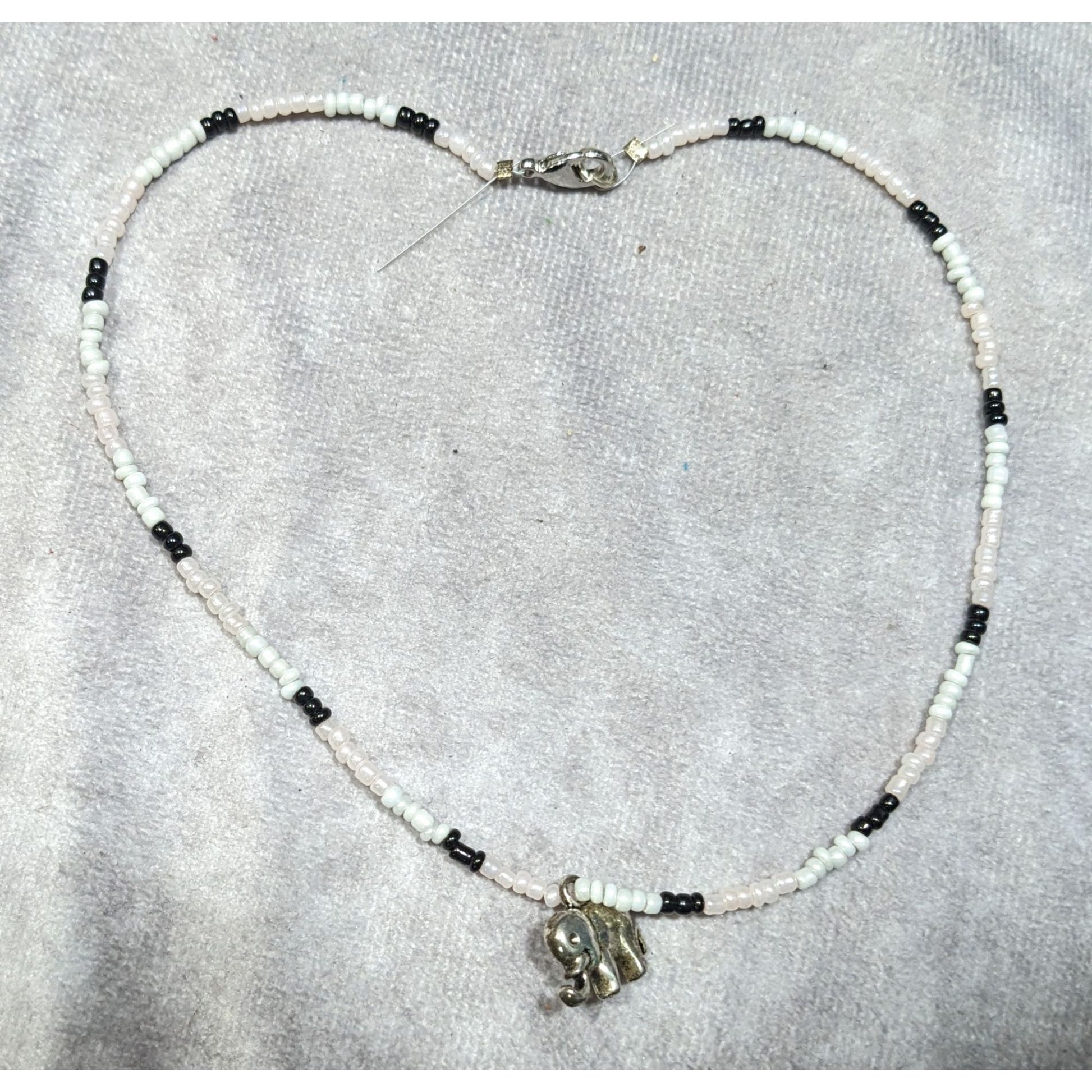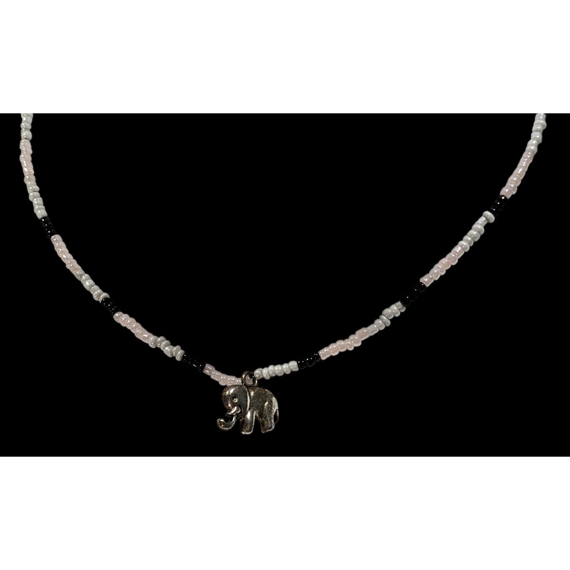 Embrace a nostalgic 90s vibe with this bohemian black and white glass beaded necklace, featuring a charming silver tone elephant pendant. Perfect for adding a touch of whimsy and style to any outfit.