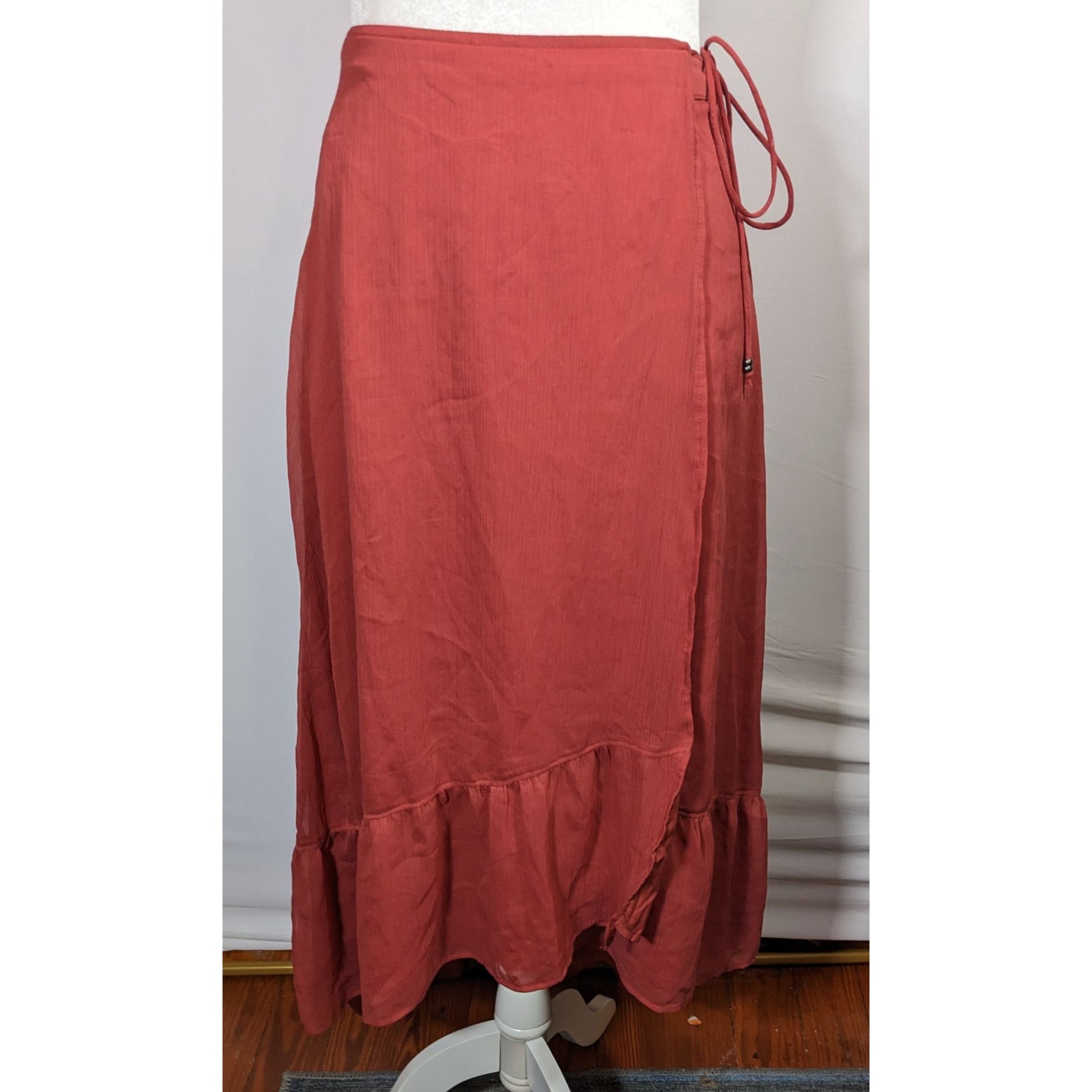 This Abercrombie & Fitch wrap skirt combines preppy and boho styles with a burgundy hue and elegant ruffles. Versatile and chic, it's perfect for any occasion.
