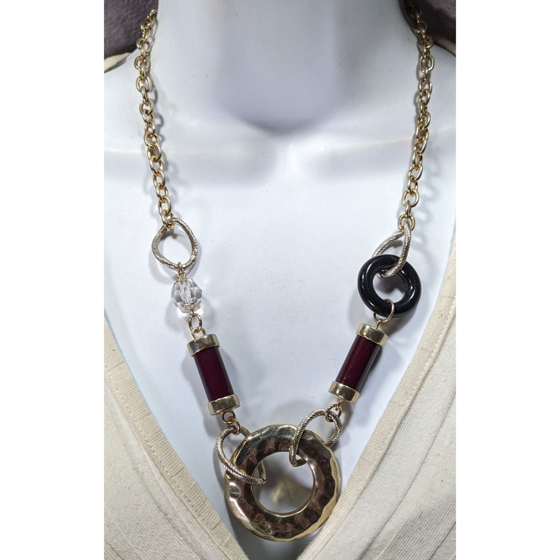 This necklace tells a tale of elegance with its silver-tone chain, hammered circle pendant, and burgundy accents. The interplay of textures and the harmonious mix of elements create a stunning piece for those who appreciate artistry in their jewelry. Its bold yet sophisticated design makes it a memorable addition to your collection.