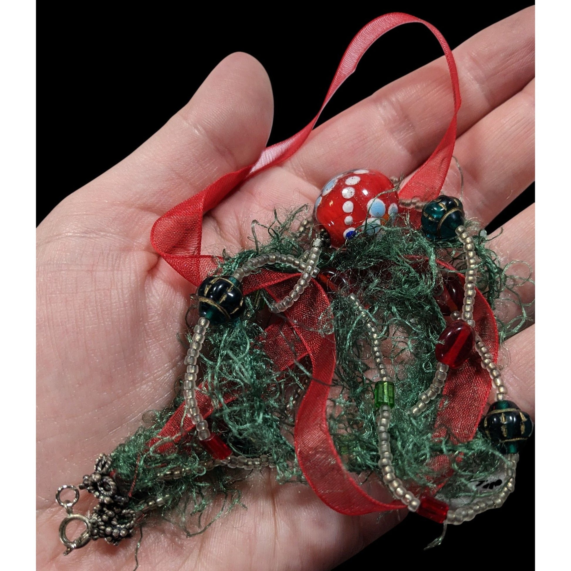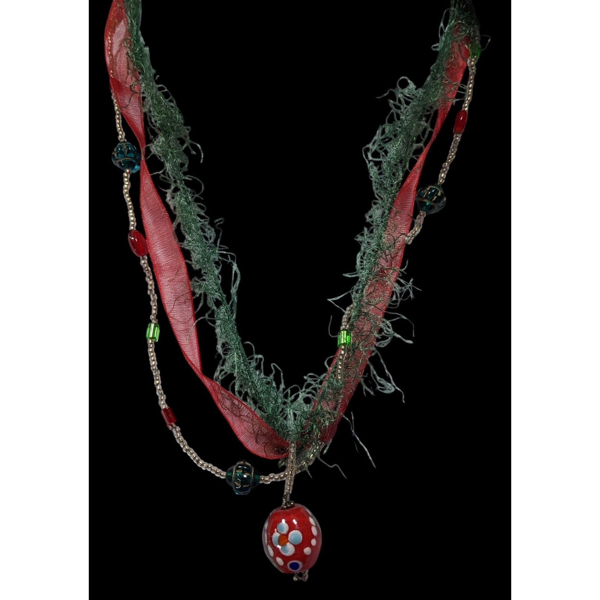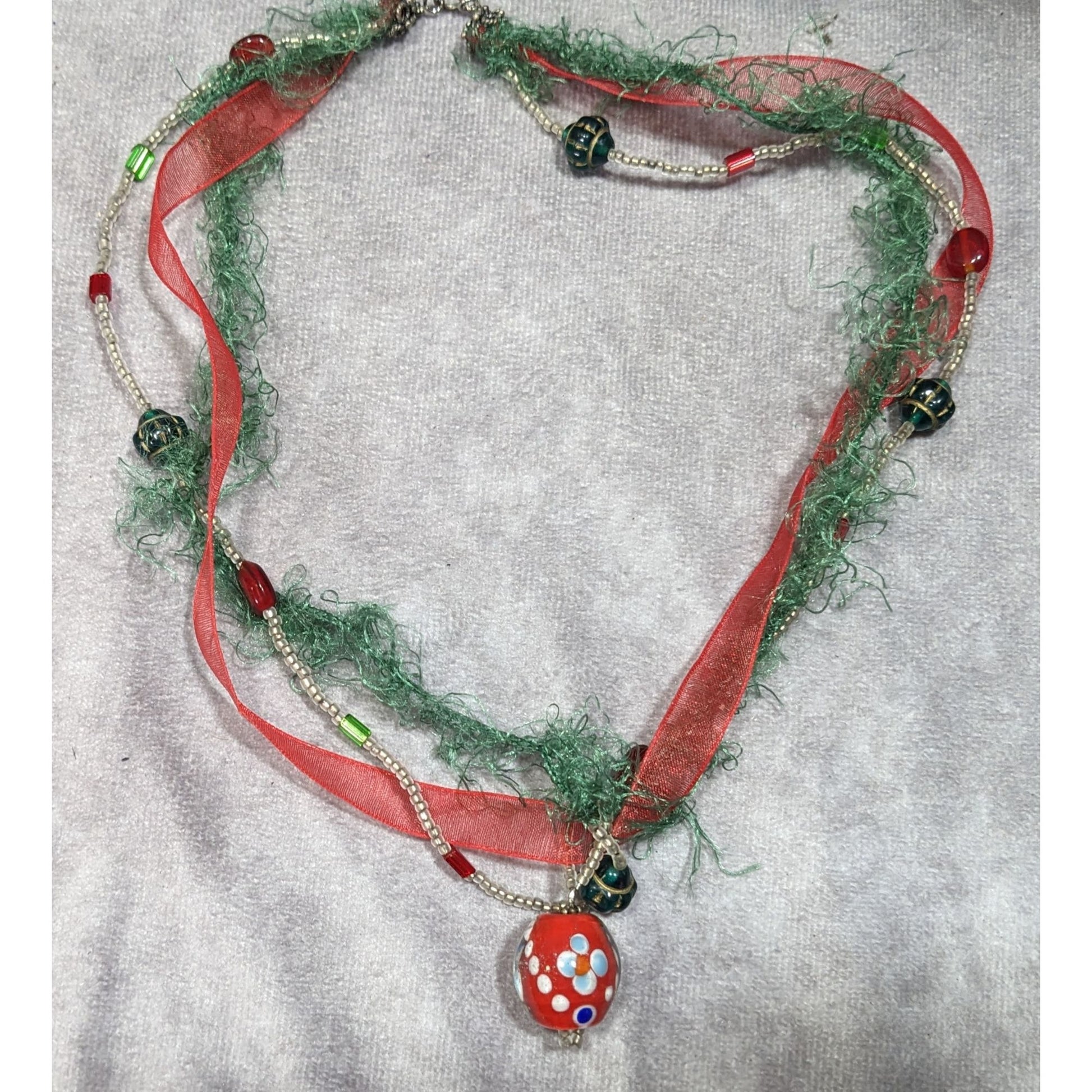 Abstract Floral Holiday Themed Red And Green Pendant Necklace