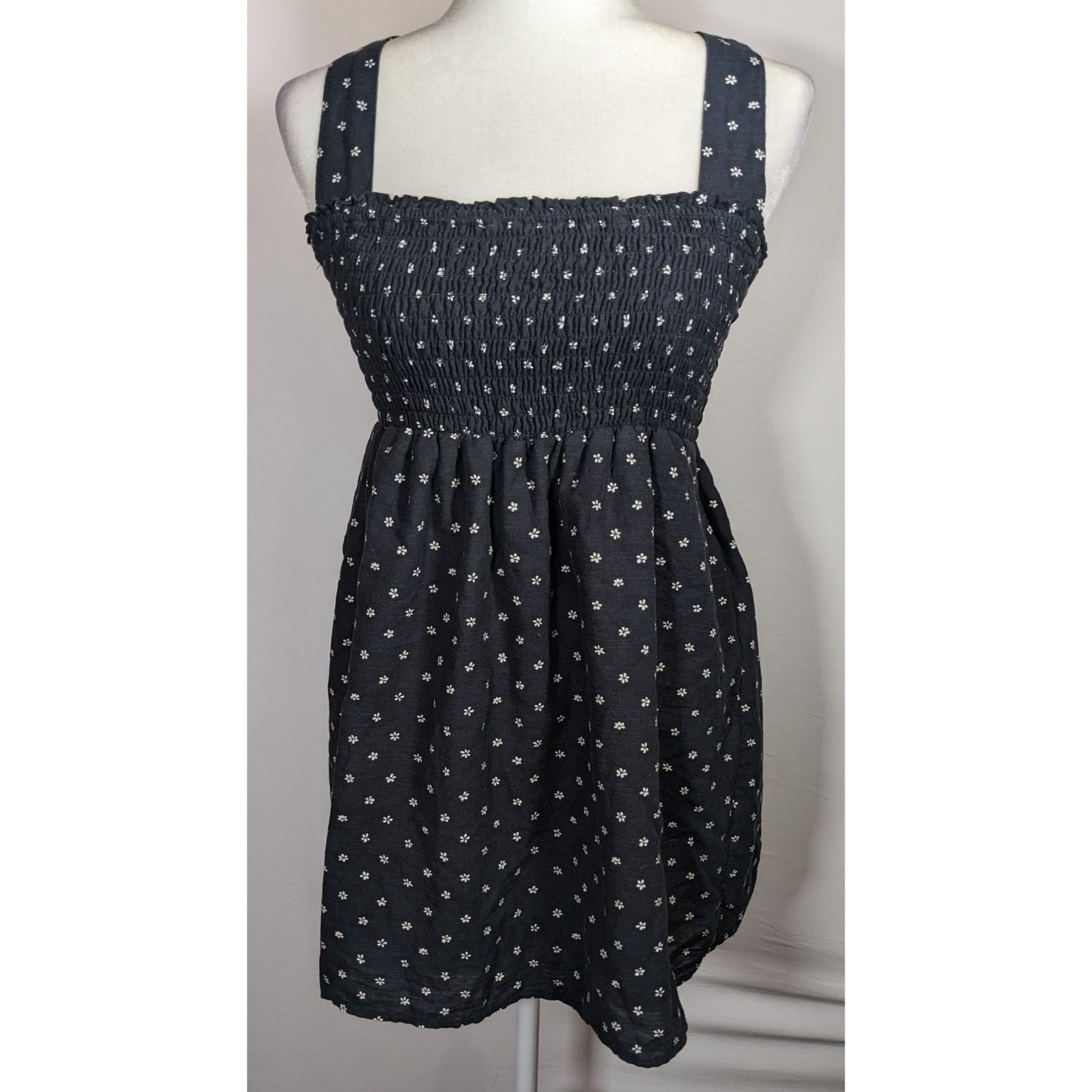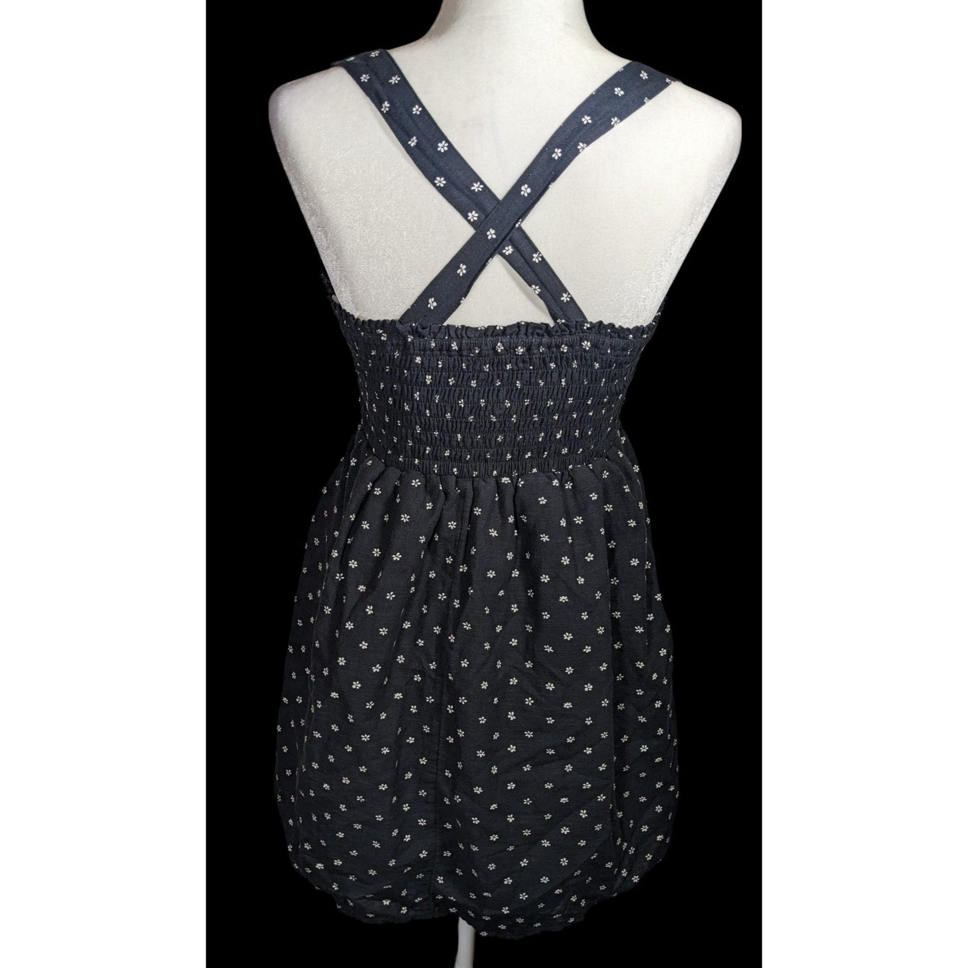 This American Eagle summery mini dress features a black floral design, perfect for casual outings or beach days. Its lightweight fabric ensures comfort and style. Ideal for warm weather.
