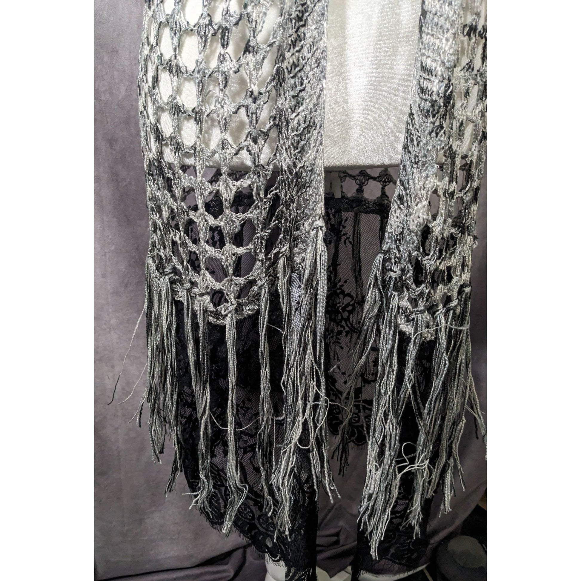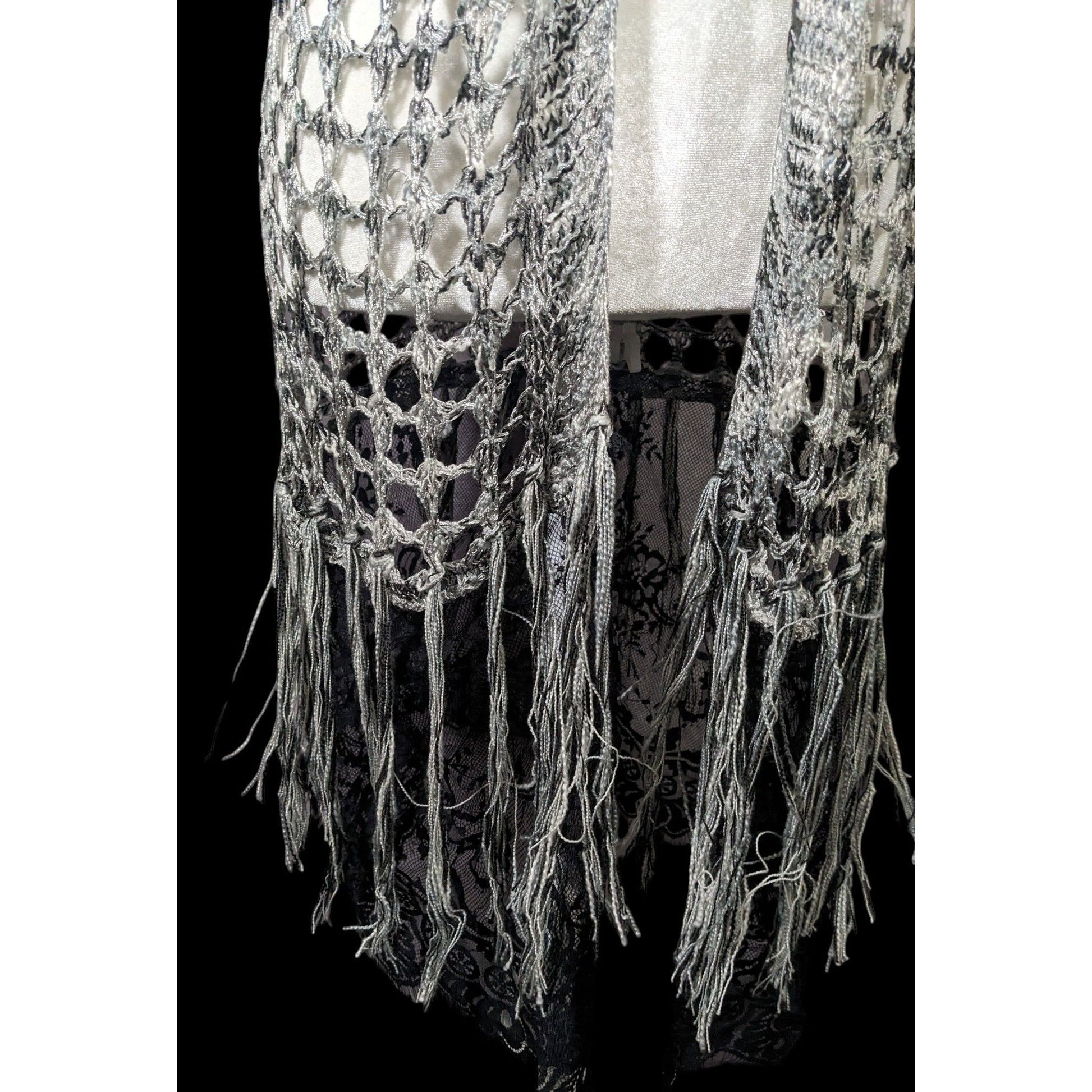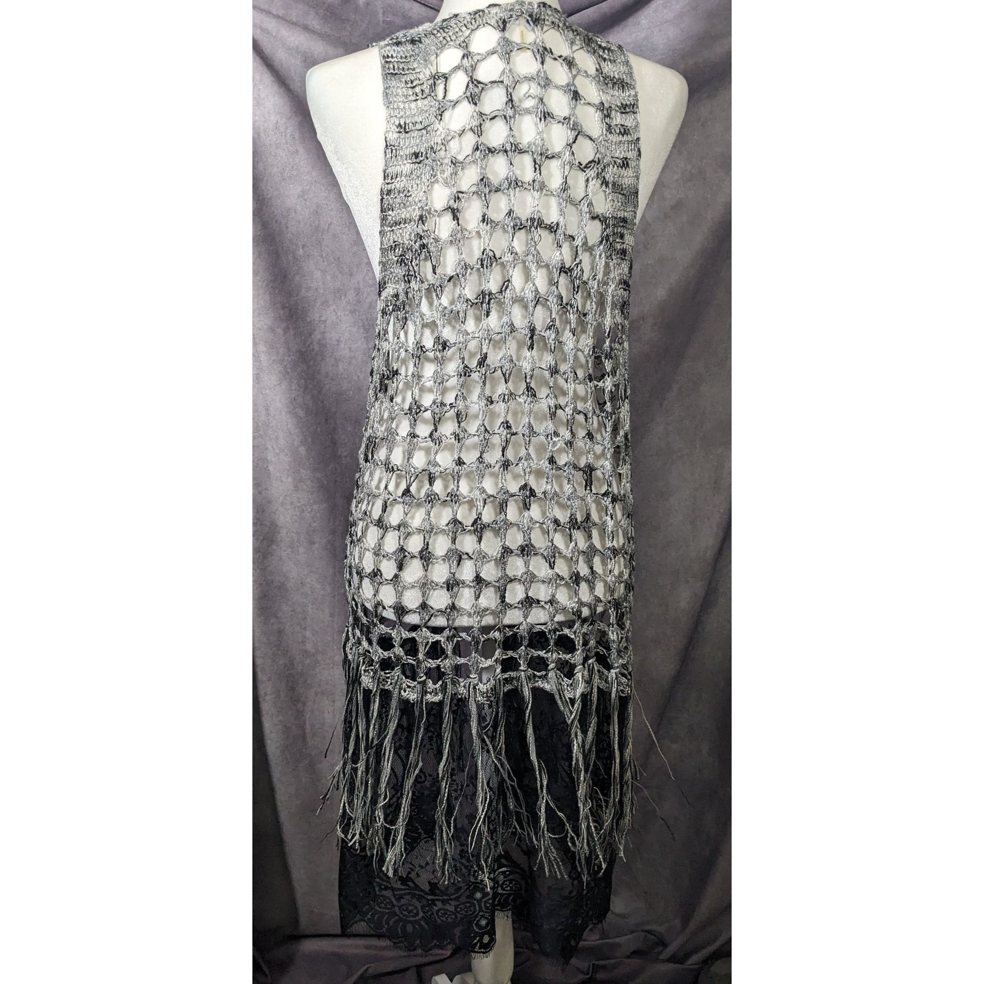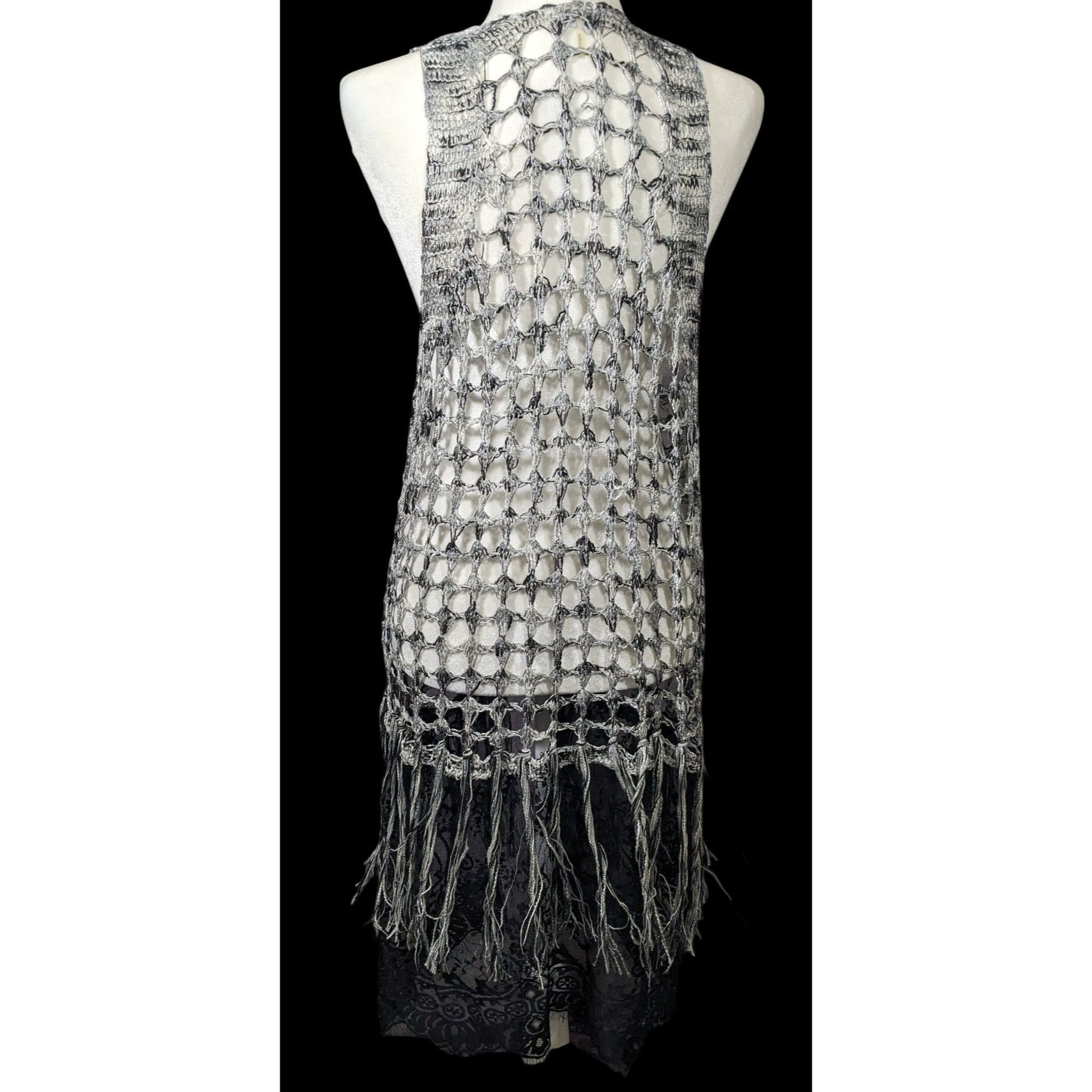 Chic and stylish knit crochet vest featuring fringe and lace details for a bohemian look. Perfect for layering over any outfit for a unique and fashionable touch.
