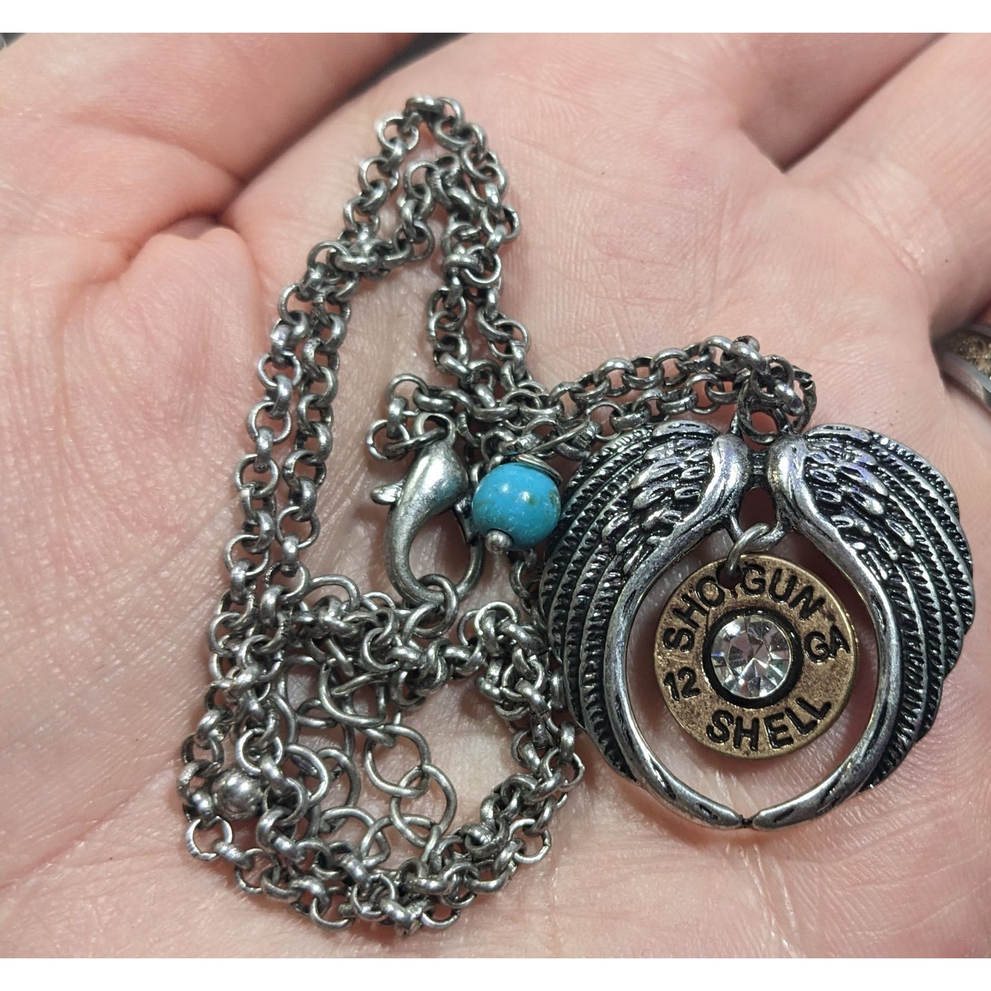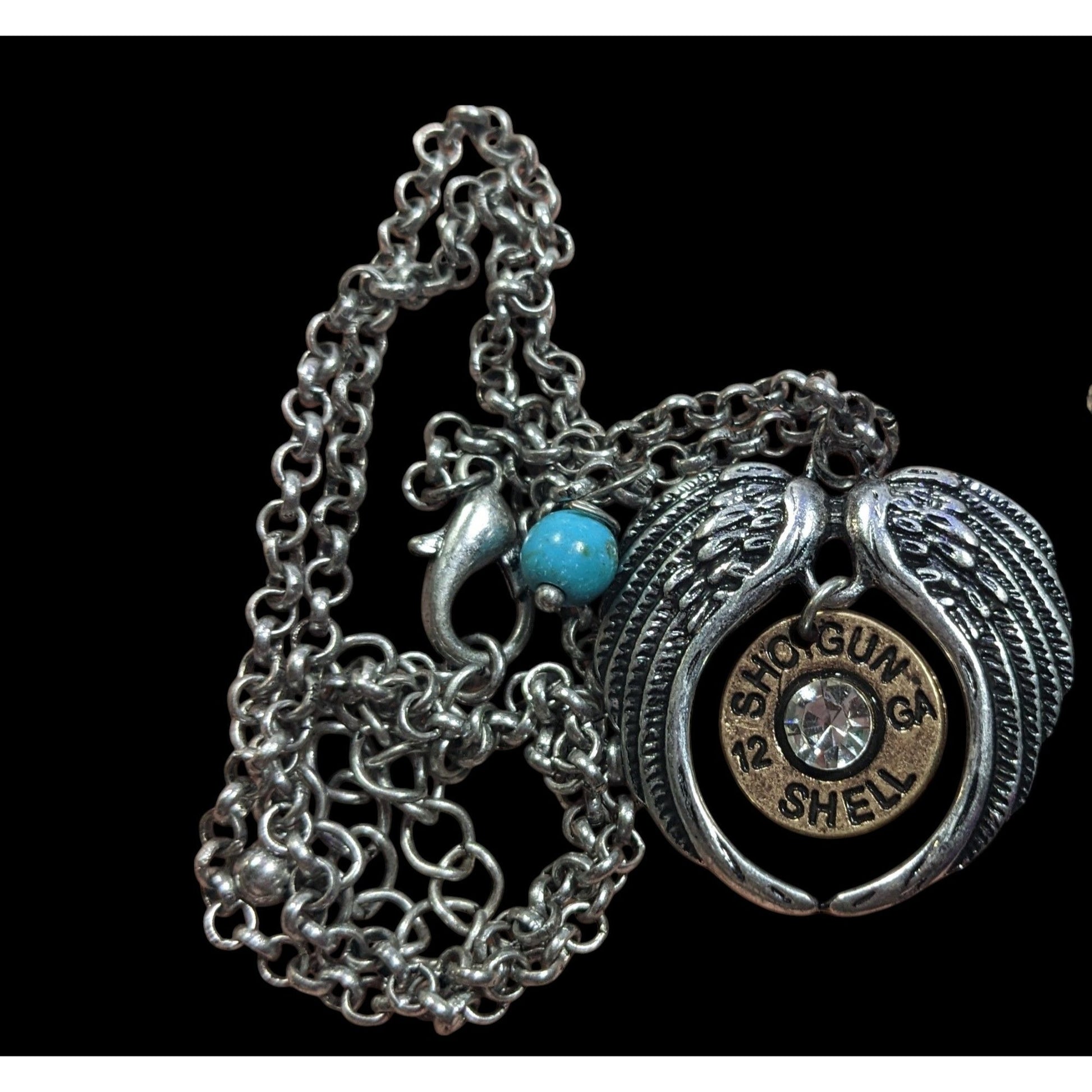This unique Angel Wing Faux Shotgun Shell Pendant Necklace combines rustic charm with elegance. A perfect statement piece for those who appreciate unique accessories with a touch of flair.