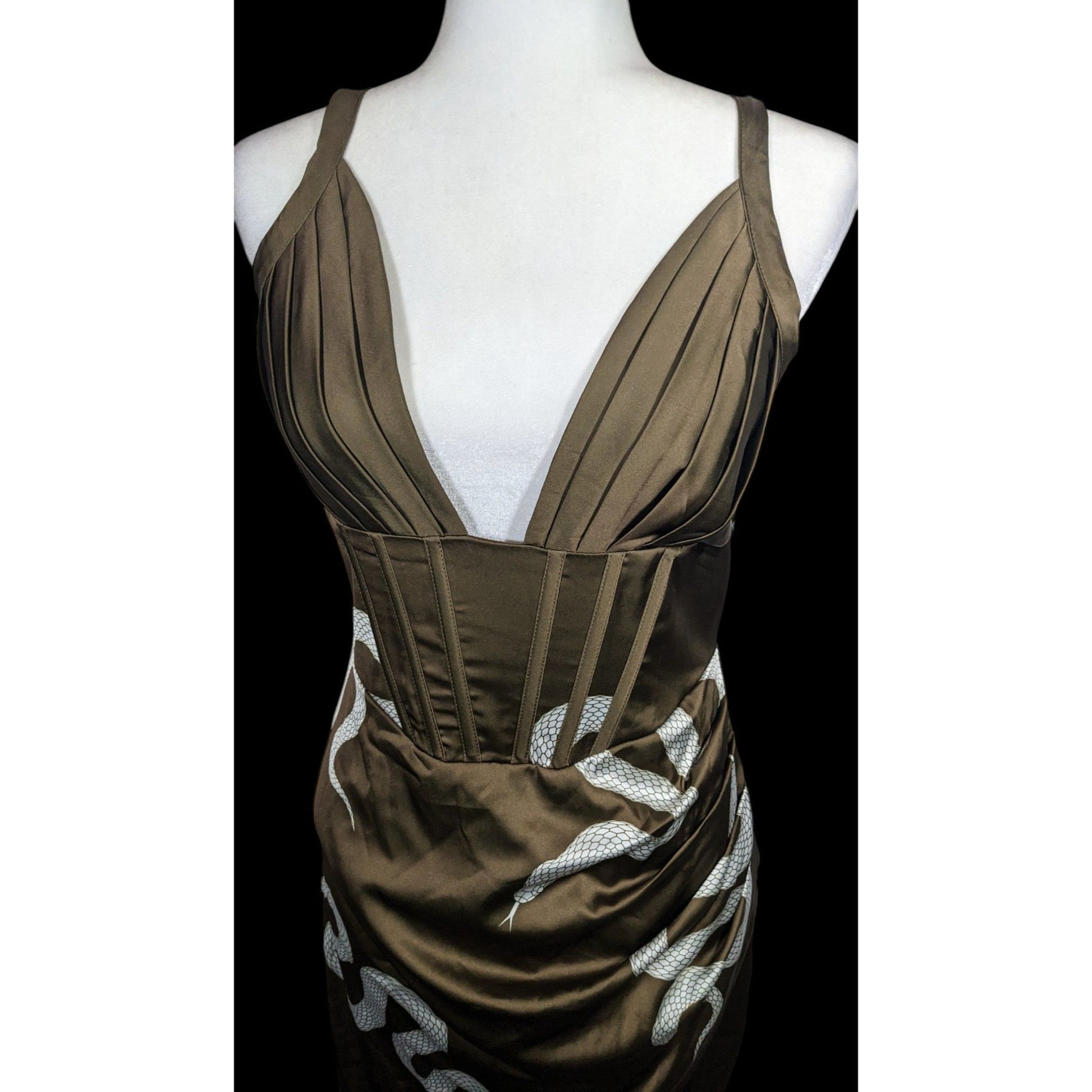 Elevate your style with the Averie Brown and White Snake Dress. Featuring a corset bodice, this dress combines elegance with a modern twist, perfect for any occasion.