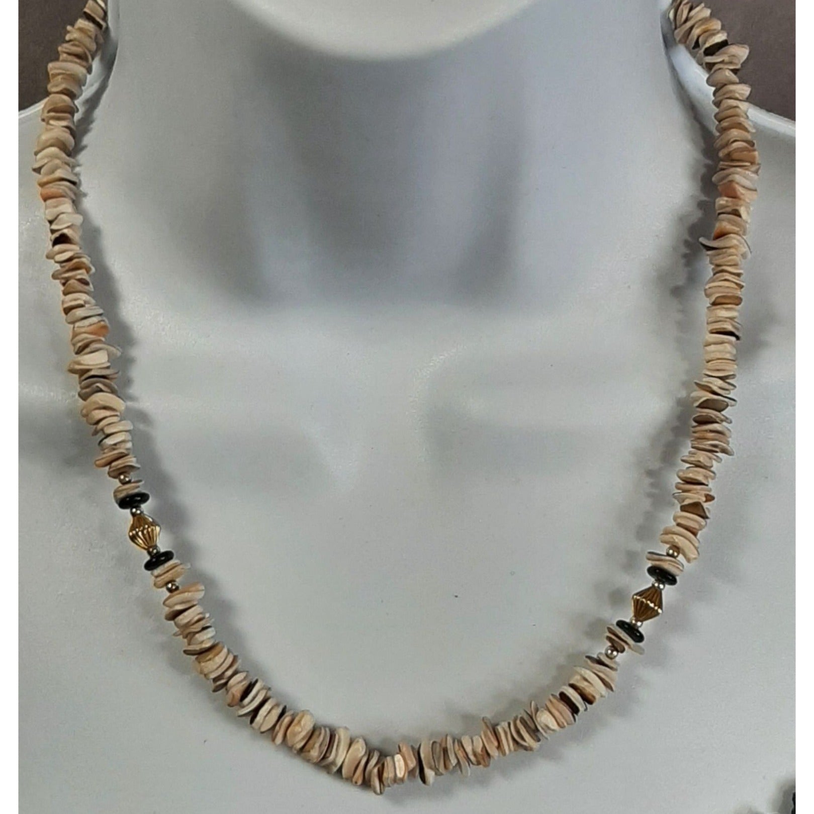 Dive into the essence of coastal elegance with this 19-inch shell necklace, adorned with gold-tone beads and black accents. A timeless piece inspired by the ocean's treasures.