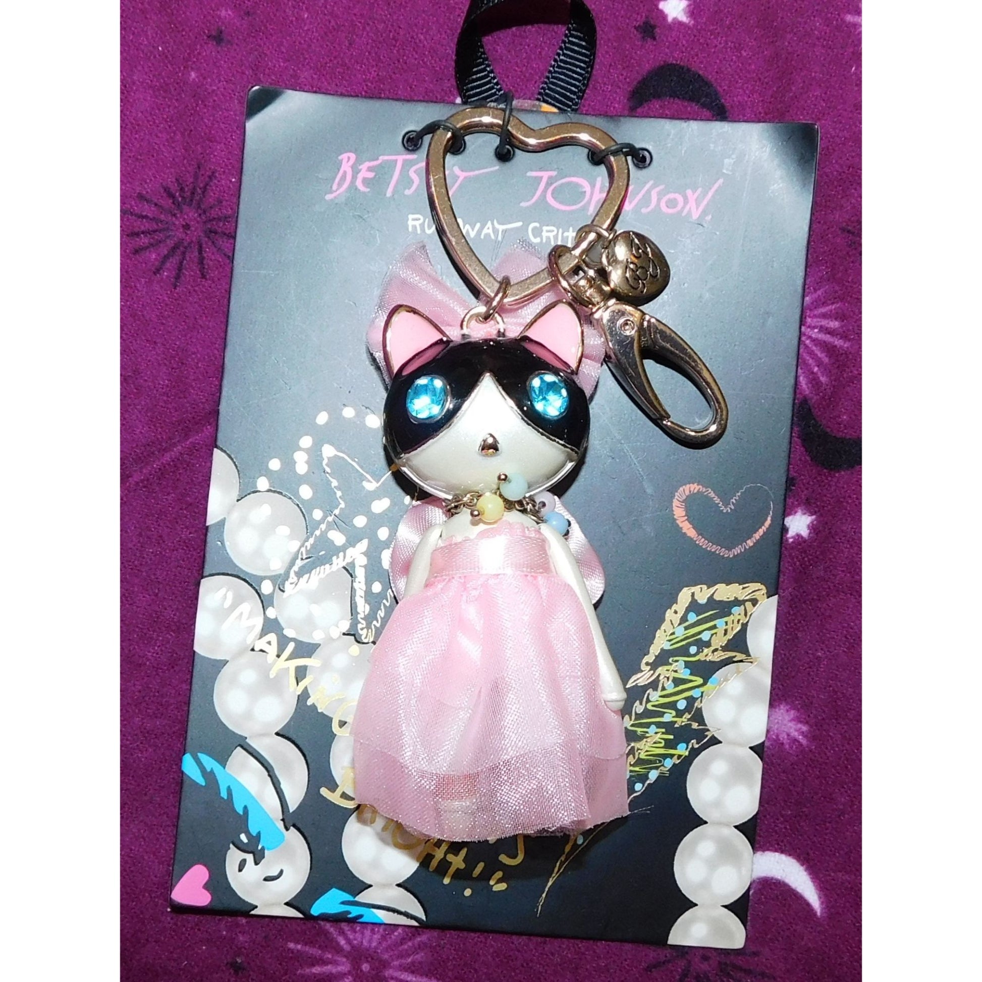 Gorgeous Betsey Johnson keychain from the Runway Critters collection. It's brand new and still in its original packaging. It's on a silver tone heart shaped keyring, and also has a self closing swivel clasp. It ha a large metal cat that's coated in black and pearlescent white enamel. It's arms and legs move independently from the body. It has large blue rhinestone eyes, and pink enamel accents on the ears. It's wearing a pink dress with a bow on the b ack, and a silver tone necklace with blue and pink accent bead. It has a pink fabric bow on its head, pink fabric accents where socks would show. This is hard to find, and great for any Betsey Johnson collector! Perfect as a gift or stocking stuffer!