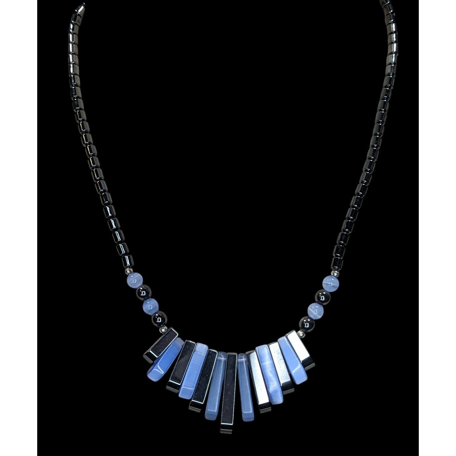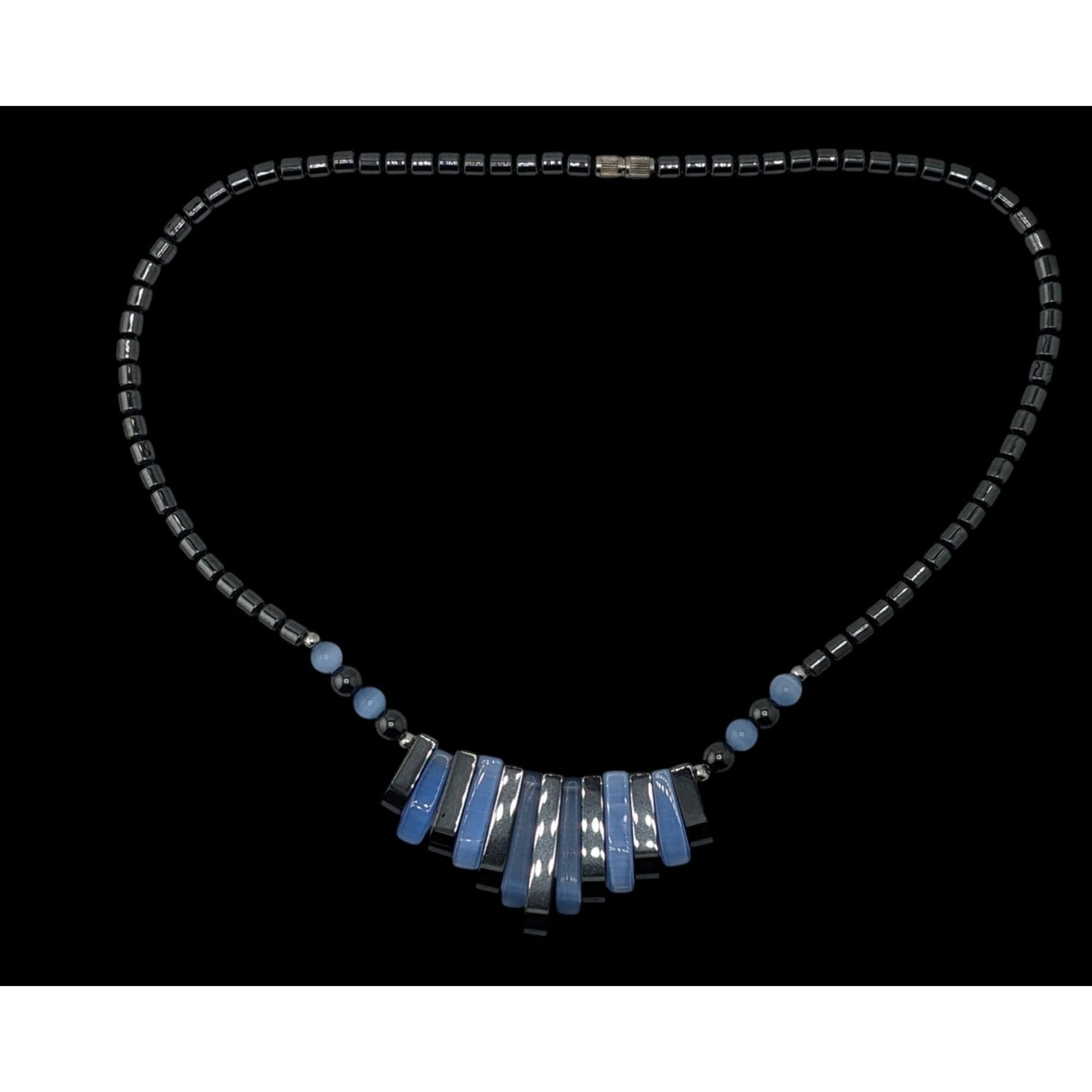 In a world of muted tones, this necklace shines. Crafted with shimmering hematite beads and radiant blue cateye glass accents, it embodies elegance and boldness. Its 16-inch length gracefully drapes, making it a standout accessory for any attire. Dive into its captivating charm and let it tell your story.